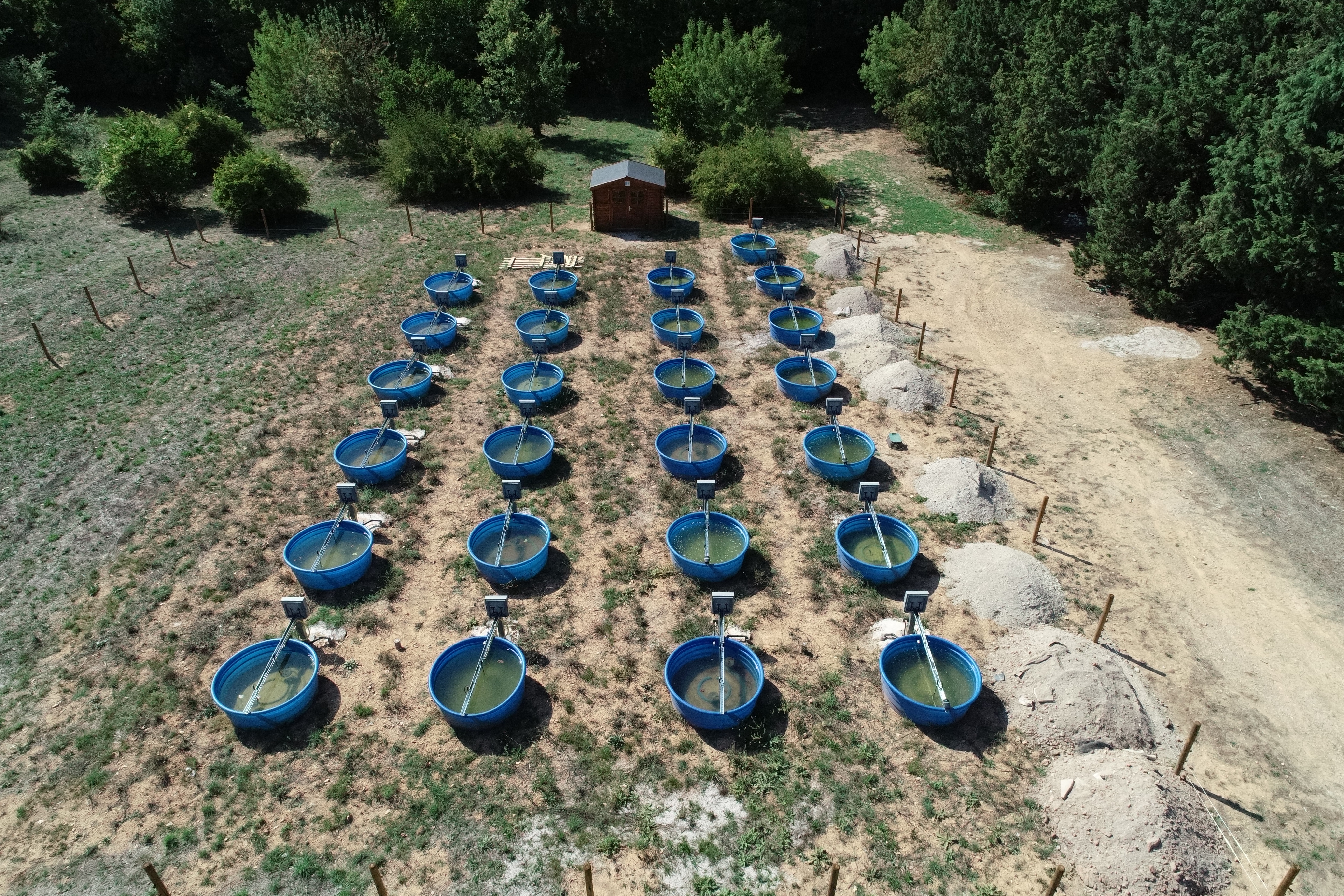 Figure 1. Photograph of the 25 mesocosms installed on the INRAE site in Aix-En-Provence. Each mesocosm contains 1000 L of water. A system of automatons coupled with immersion heaters allows the mesocosms to be heated in a controlled manner. Thus, it is possible to heat each mesocosm by a certain number of degrees compared to a reference mesocosm which follows the natural fluctuations of the Aix-en-Provence climate. This installation therefore makes it possible to test climate warming scenarios (from +1 to + 8 ° C) while maintaining seasonal and daily fluctuations in temperature.